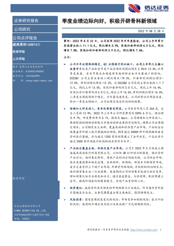 威高骨科在2022年上半年保持了稳健的业绩增长,尤其是在第二季度,通过有效的经营策略和市场应对,显著提升了业绩水平,抵消了不利因素的影响。