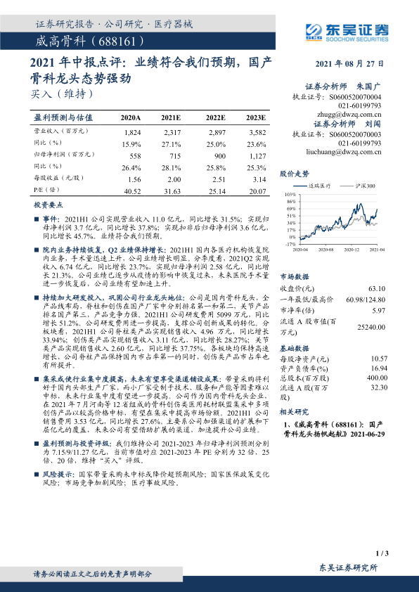 本报告的核心观点是威高骨科在2021年上半年展现出强劲的业绩增长,其表现符合市场预期,并进一步巩固了公司在国内骨科市场的龙头地位。公司受益于国内医疗机构院内业务的持续恢复,手术量显著回升,带动了各产品线的销售增长。