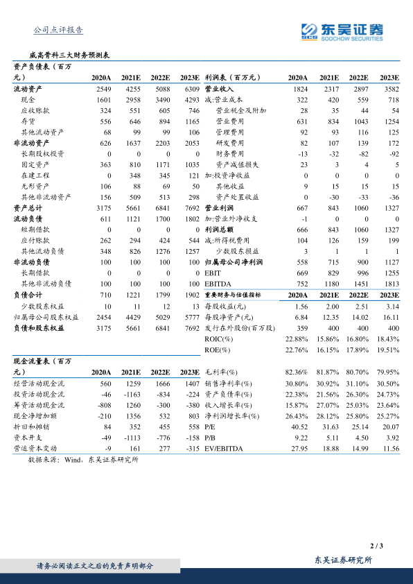 威高骨科在2021年上半年实现了符合预期的强劲业绩增长,营业收入和归母净利润均实现超过30%的同比增长。这主要得益于国内医疗机构手术量的恢复以及公司在研发和渠道方面的战略投入。公司在脊柱、创伤和关节等骨科细分领域均保持领先地位或高速增长,并通过持续的研发投入巩固了其行业龙头地位。面对国家带量采购政策,威高骨科凭借其头部企业的优势和积极的渠道扩展策略,有望在行业集中度提升中进一步扩大市场份额。分析师维持对公司未来三年盈利的乐观预测和“买入”评级,但同时提示了与政策、市场竞争和运营相关的潜在风险。