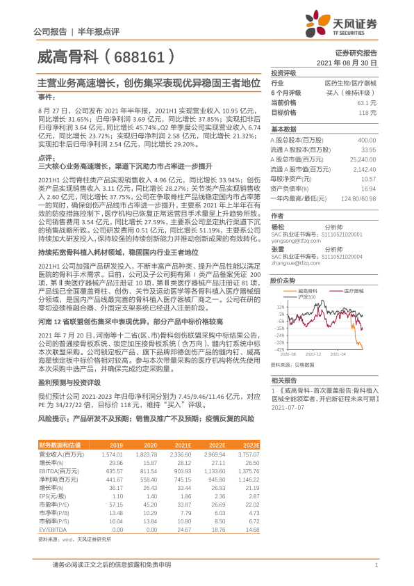 威高骨科发布2021年半年报,报告期内: