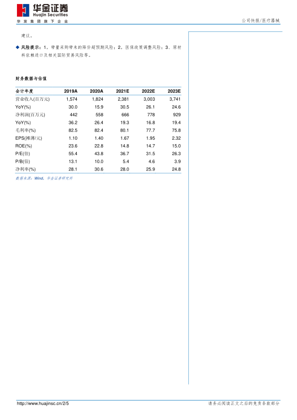 投资建议:考虑到集采降幅超出我们此前预期,我们略微下调公司盈利预测,预测公司2021年至2023年每股收益分别为1.67、1.95和2.32元(原预测值为1.75、2.16和2.68元)。目前公司估值已经回到相对合理区间,由于在集采政策扰动之下,行业扩容、进口替代、及产品迭代等多个路径带来的公司增长潜能并未被充分预期,我们预计集采靴子暂时落地之后公司可能迎来修复机会,维持公司增持-A建议。