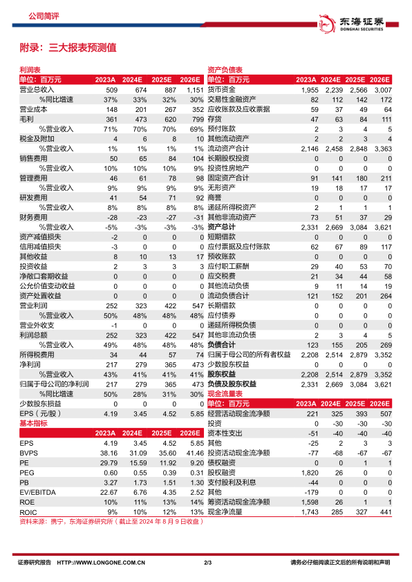 业绩快速增长,利润端增速亮眼。2024H1,公司实现营收2.64亿元(YoY+28.43%)、归母净利润1.24亿元(YoY+57.93%)、扣非归母净利润1.20亿元(YoY+56.33%);其中Q2单季度实现营收1.52亿元(YoY+32.43%)、归母净利润0.72亿元(YoY+60.78%)、扣非归母净利润0.72亿元(YoY+68.25%)。公司业绩保持快速增长态势。