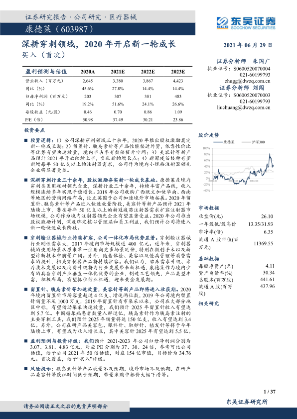 投资逻辑:1)公司深耕穿刺领域三十余年,2020年推出股权激励奠定新一轮成长期;2)留置针、胰岛素针等产品性能接近外资,依靠性价比等优势有望快速放量,境内市占率有数倍提升空间;3)美容针等新产品预计2021年开始陆续上市,贡献新的增长点;4)新冠疫苗接种有望新增每年50亿支以上的注射器需求,公司作为境内小规格注射器领先企业将显著受益。