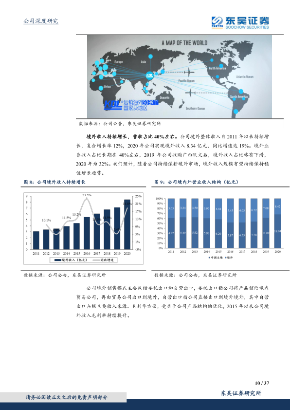 在市场布局方面,公司境内收入长期来源于华东地区,2015年至2020年复合增长率为14.8%。2019年并购广西瓯文后,华南地区收入占比快速提升,2020年实现营收10.16亿元,占境内收入的56%,华东地区占比降至31%。境外市场方面,公司产品销往50多个国家和地区,与Mckesson、BD、Medline等国际知名医疗器械公司建立了长期合作关系。境外收入自2011年以来持续增长,复合增长率达12%,2020年实现境外收入8.34亿元,同比增长19%,境外业务收入占比长期维持在40%左右(2020年为32%)。公司境外销售以自营出口为主,毛利率持续提升。