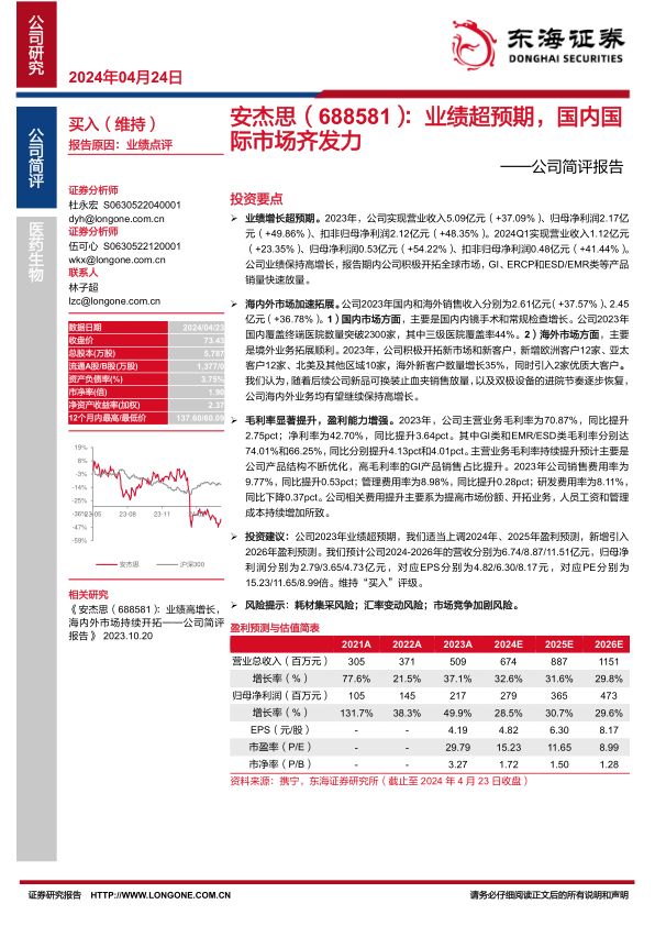 安杰思2023年业绩表现强劲,国内外市场拓展顺利,盈利能力显著提升。东海证券研究所上调了对公司未来盈利的预测,并维持“买入”评级。但同时也提示了耗材集采、汇率变动和市场竞争加剧等风险。
