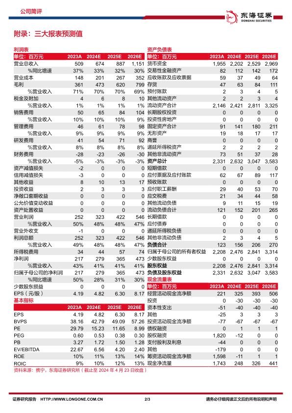 投资建议:公司2023年业绩超预期,我们适当上调2024年、2025年盈利预测,新增引入2026年盈利预测。我们预计公司2024-2026年的营收分别为6.74/8.87/11.51亿元,归母净利润分别为2.79/3.65/4.73亿元,对应EPS分别为4.82/6.30/8.17元,对应PE分别为15.23/11.65/8.99倍。维持“买入”评级。