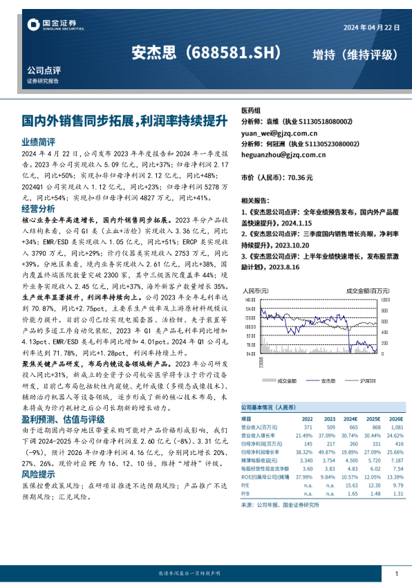 安杰思在2023年和2024年一季度表现出色,营收和净利润均实现显著增长。公司核心业务增长强劲,国内外市场同步拓展,盈利能力持续提升。同时,公司积极布局内镜设备领域新产品,为长期发展奠定基础。尽管面临带量采购的潜在影响,但公司凭借其竞争优势和战略布局,仍具有良好的发展前景,维持“增持”评级。