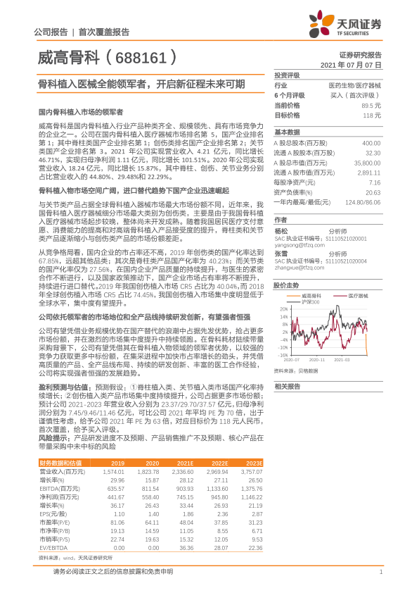 盈利预测与估值: 基于脊柱、关节市场国产化率持续增长,创伤市场集中度提升,公司在集采中获取更多份额,以及关节产品销量快速增长的假设,预计公司2021-2023年营业收入分别为23.37/29.70/37.57亿元,归母净利润分别为7.45/9.46/11.46亿元。考虑到可比公司2021年平均PE为70倍,给予公司2021年63倍PE,对应目标价118元人民币,首次覆盖给予“买入”评级。