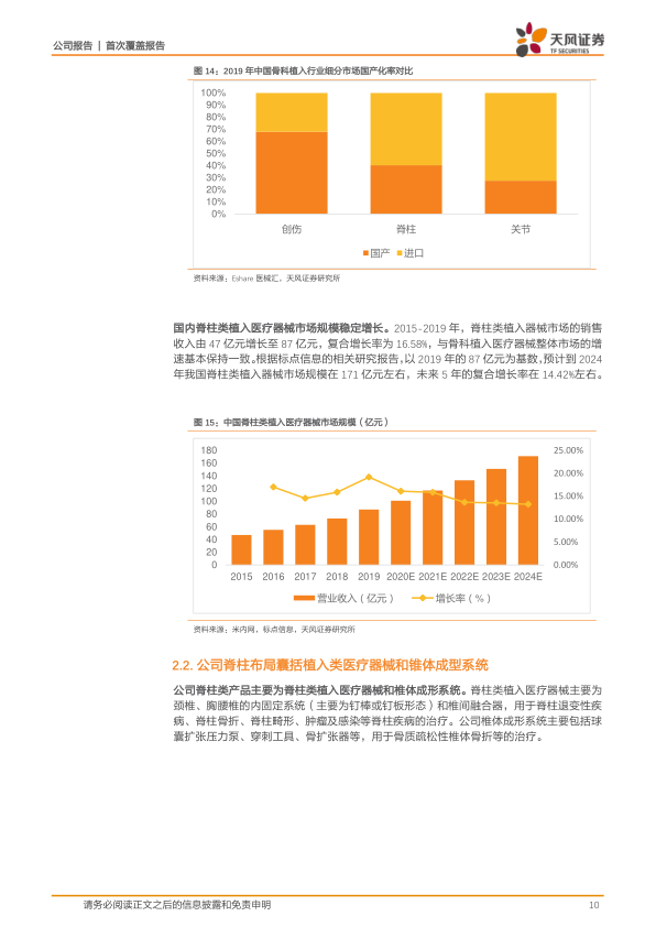 创伤业务: 创伤类植入物主要用于四肢、肋骨、手指、足踝、骨盆等部位骨折的手术治疗。2014-2019年,股骨骨折和多部位骨折出院人数复合增长率达16.89%。创伤类产品是中国骨科植入器械最大的细分市场,2015-2019年市场规模从51亿元增长至92亿元,复合增长率15.76%,预计到2024年将达到170亿元。2019年创伤类国产化率高达67.85%。威高骨科的创伤产品线全面,包括锁定接骨板系统、髓内钉系统等,2019年市场份额为4.66%,位居国内厂商第二。中国创伤植入市场集中度(2019年CR5为40.04%)远低于全球水平(2018年CR5为74.45%),未来集中度有望提升,公司有望凭借规模优势和集采竞争力持续提升市场份额。公司持续研发升级,如外固定支架系统和万向锁定接骨板系统,以推陈出新。