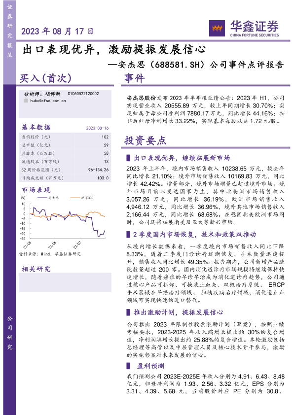 安杰思2023年半年报业绩表现优异,出口市场成为主要增长引擎,国内市场二季度显著恢复。公司推出股权激励计划,彰显对未来发展的信心。报告看好公司在内镜诊疗赛道的技术竞争力,首次覆盖给予“买入”评级,并预测公司未来三年收入和净利润将保持快速增长。但同时也提示了医保控费、销售渠道拓展、在研项目推进、海外市场拓展以及股权激励计划实施等风险。