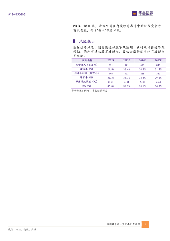 我们预测公司2023E-2025E年收入分别为4.91、6.43、8.48亿元,归母净利润为1.93、2.56、3.32亿元,EPS分别为3.31、4.39、5.68元,当前股价对应PE分别为30.8、23.3、18.0倍,看好公司在内镜诊疗赛道中的技术竞争力,首次覆盖,给予“买入”投资评级。
