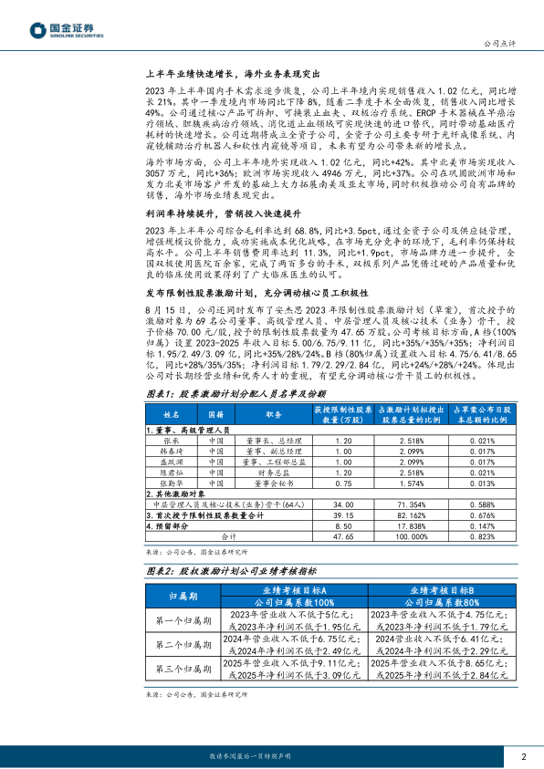 分季度来看, 2023Q2 公司实现收入 1.15 亿元,同比+44%; 归母净利润 4458 万元,同比+64%;扣非归母净利润 4262 万元,同比+38%。公司当日同时发布 2023 年限制性股票激励计划(草案), 拟向公司员工授予 47.65 万股限制性股票,授予价格 70.00 元/股。