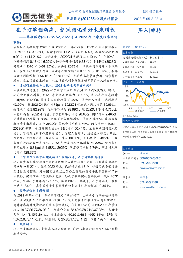 本报告分析了华康医疗2022年及2023年一季度的财务表现,指出公司营收持续增长,但一季度受费用和成本影响净利润亏损。公司在手订单充足,为未来业绩提供保障。同时,公司在营销和研发方面持续投入,虽然短期内影响了利润,但长期来看有利于提升竞争力。报告维持对华康医疗的“买入”评级,并预测未来三年公司营收和净利润将保持快速增长。但同时也提示了行业竞争、订单不确定性、应收账款和项目推进等风险。