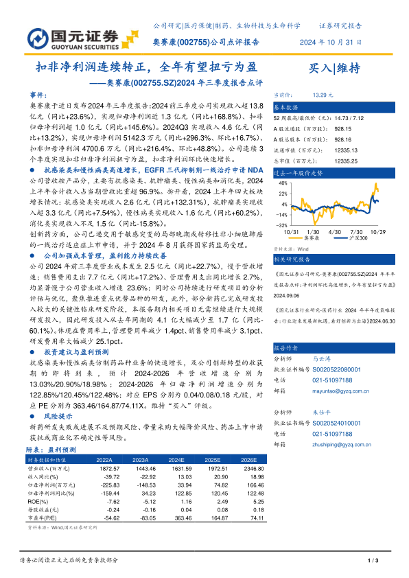 奥赛康在2024年前三季度实现了显著的业绩反转,收入和利润均实现高速增长,特别是扣非净利润连续三个季度扭亏为盈,全年有望实现整体盈利。这一积极表现主要得益于抗感染类和慢性病类仿制药业务的强劲增长,以及公司在成本费用控制和研发投入优化方面的有效管理。同时,创新药EGFR三代抑制剂一线治疗适应症上市申请的受理,标志着公司创新转型战略的逐步落地,为未来增长注入了新动力。分析师基于公司良好的发展态势和未来增长潜力,维持“买入”评级,并对未来几年的营收和净利润增长持乐观预期,但也提示了新药研发、带量采购等潜在风险。
