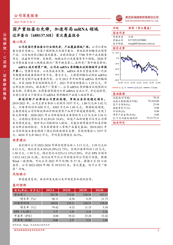 基于可比公司估值法,可比公司2023年平均PE为27倍。考虑到近岸蛋白在国内重组蛋白和mRNA原料酶及试剂领域的领先地位和稀缺性,报告首次覆盖给予公司“推荐”评级。