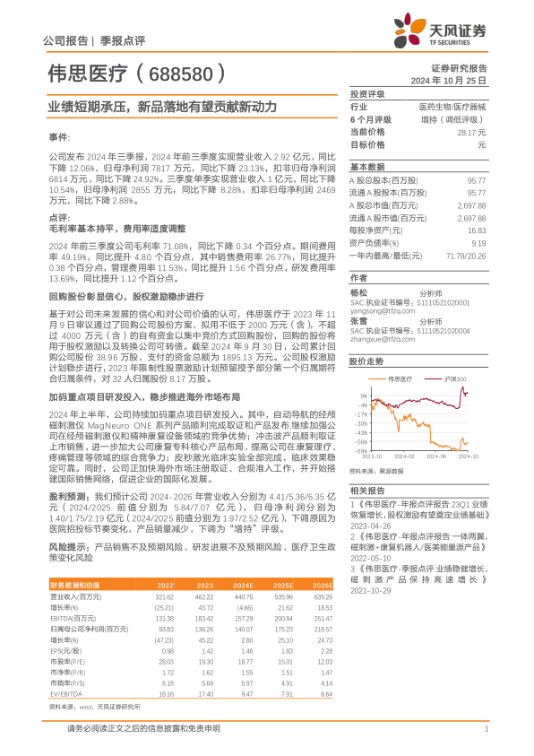 本报告分析了伟思医疗2024年三季报,指出公司业绩短期承压,但通过加大研发投入和拓展海外市场,有望迎来新的增长动力。报告维持“增持”评级,但下调了盈利预测,并提示了相关风险。投资者应关注公司新品的上市销售情况和海外市场拓展进度,以及医疗政策变化带来的影响。