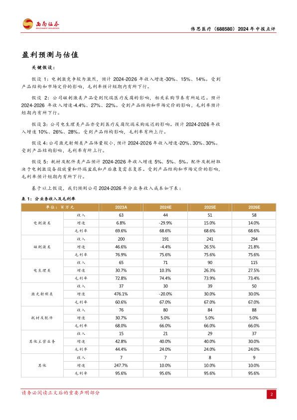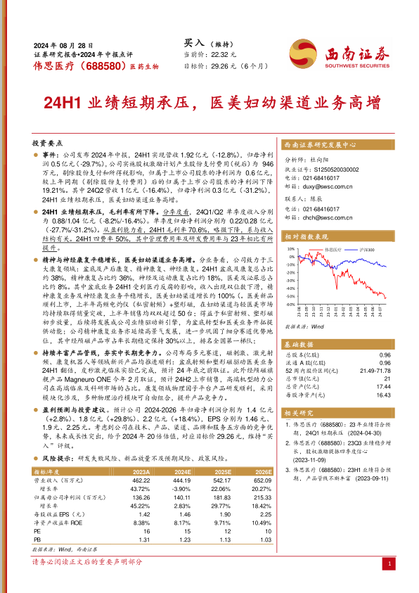 伟思医疗2024年上半年业绩短期承压,主要受传统盆底业务下滑和股权激励费用影响。然而,公司在医美妇幼渠道业务实现高速增长,新产品如高频电灼仪和塑形磁表现亮眼,经颅磁产品市场份额领先,且持续丰富产品管线,为中长期发展奠定基础。分析师维持“买入”评级,并基于公司在新型康复器械领域的核心竞争力,预计未来业绩将逐步恢复并实现增长,但需警惕研发、新品放量及政策风险。