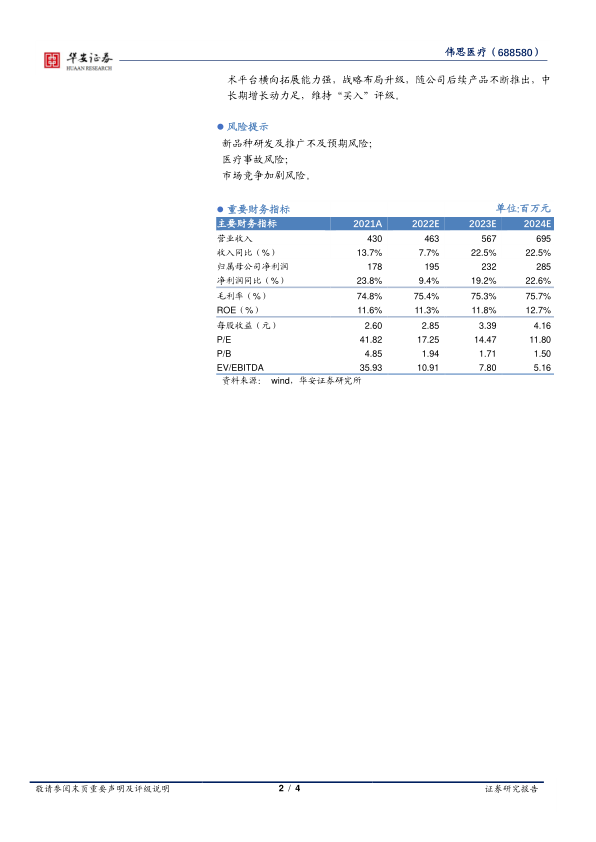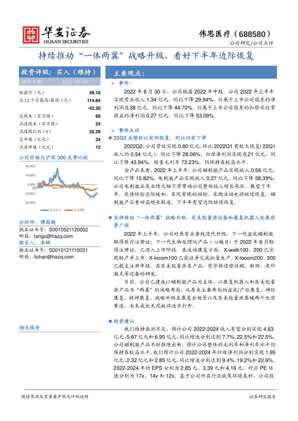 我们维持盈测不变,预计公司2022-2024收入有望分别实现4.63亿元、5.67亿元和6.95亿元,同比增速分别达到7.7%、22.5%和22.5%。公司磁刺激产品不断推陈出新,预计公司整体的毛利率和净利率水平仍保持在较高水平,我们预计公司2022-2024年归母净利润分别实现1.95亿元、2.32亿元和2.85亿元,同比增速分别达到9.4%、19.2%和22.6%。2022-2024年的EPS分别为2.85元、3.39元和4.16元,对应PE估值分别为17x、14x和12x。基于公司所在行业政策环境友好,公司技术平台横向拓展能力强,战略布局升级,随公司后续产品不断推出,中长期增长动力足,维持“买入”评级。