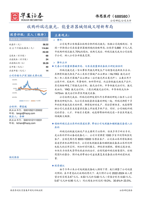 本报告分析了伟思医疗收购科瑞达激光的事件,指出此次收购有助于完善公司在能量源器械领域的布局,并借助科瑞达在泌尿科的渠道优势,带动公司相关设备进入泌尿科。报告同时调整了公司的盈利预测,并维持“买入”评级,但提醒投资者注意新品种研发及推广不及预期、医疗事故和市场竞争加剧等风险。