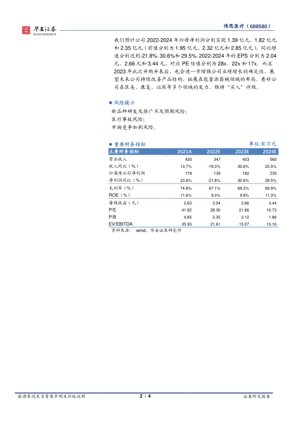 我们预计公司 2022-2024 年归母净利润分别实现 1.39 亿元、 1.82 亿元和 2.35 亿元( 前值分别为 1.95 亿元、 2.32 亿元和 2.85 亿元),同比增速分别达到-21.8%、 30.6%和 29.5%。 2022-2024 年的 EPS 分别为 2.04元、 2.66 元和 3.44 元,对应 PE 估值分别为 28x、 22x 和 17x。 而且2023 年此次并购并表后,也会进一步增强公司业绩增长的确定性,展望未来公司持续改善产品结构, 拓展在能量源器械领域的布局,看好公司在医美、康复、泌尿等多个领域的发力, 维持“买入” 评级。