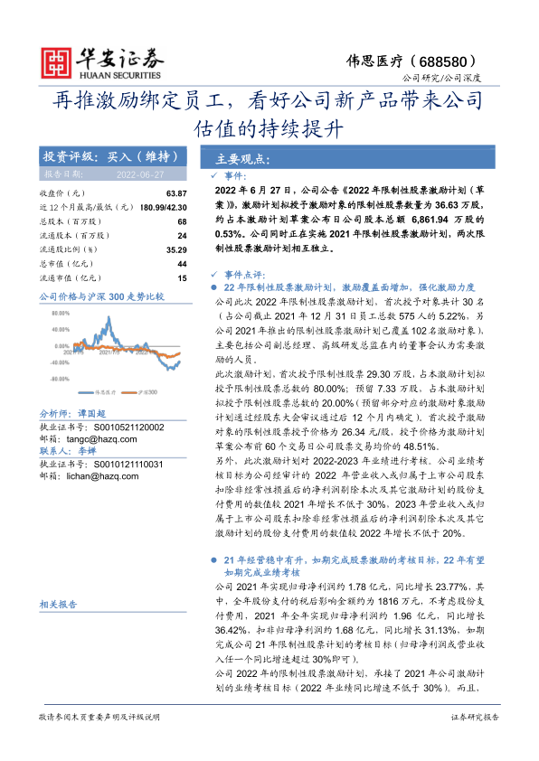 22年限制性股票激励计划,激励覆盖面增加,强化激励力度公司此次2022年限制性股票激励计划,首次授予对象共计30名(占公司截止2021年12月31日员工总数575人的5.22%,另公司2021年推出的限制性股票激励计划已覆盖102名激励对象),主要包括公司副总经理、高级研发总监在内的董事会认为需要激励的人员。