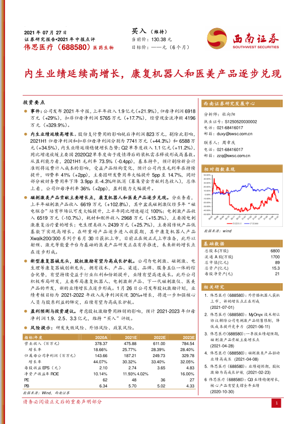 本报告分析了伟思医疗2021年中报,指出公司内生业绩延续高增长态势,剔除股份支付费用影响后,归母净利润和扣非归母净利润均实现显著增长。同时,磁刺激类产品成为主要增长点,康复机器人和医美产品逐步兑现,为公司未来发展提供新的增长动力。