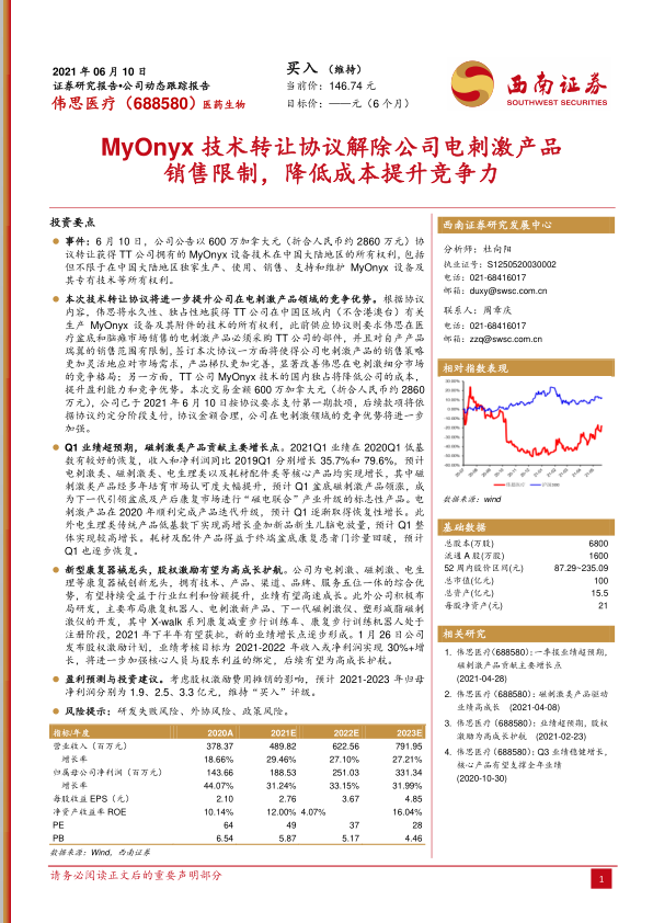 伟思医疗通过成功收购MyOnyx设备技术,显著增强了其在电刺激产品领域的市场竞争力和盈利能力。公司2021年第一季度业绩表现强劲,磁刺激产品成为核心增长引擎,展现出“磁电联合”产业升级的巨大潜力。作为康复器械领域的创新领导者,伟思医疗凭借其综合优势和积极的研发投入,正逐步形成新的业绩增长点,并通过股权激励计划为未来的高速发展提供坚实保障。尽管存在研发、外协和政策等风险,但基于稳健的财务预测和持续增长的盈利能力,报告维持了“买入”评级,预示着公司未来良好的发展前景。