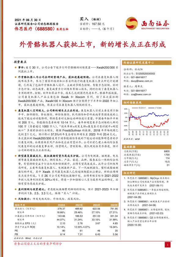 本报告主要围绕伟思医疗的外骨骼机器人获批上市事件展开,分析了其对公司未来发展的影响,并维持了“买入”评级。