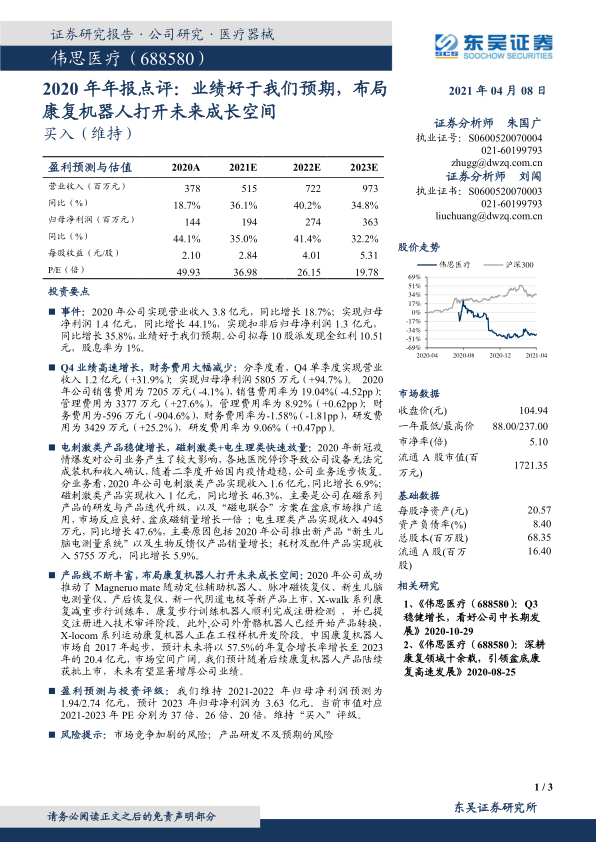 伟思医疗2020年业绩表现亮眼,超出市场预期,Q4业绩尤其突出。公司在电刺激类产品保持稳健增长的同时,磁刺激类和电生理类产品实现快速放量,产品结构持续优化。公司积极布局康复机器人领域,有望打开未来成长空间。维持“买入”评级,但需关注市场竞争和产品研发风险。