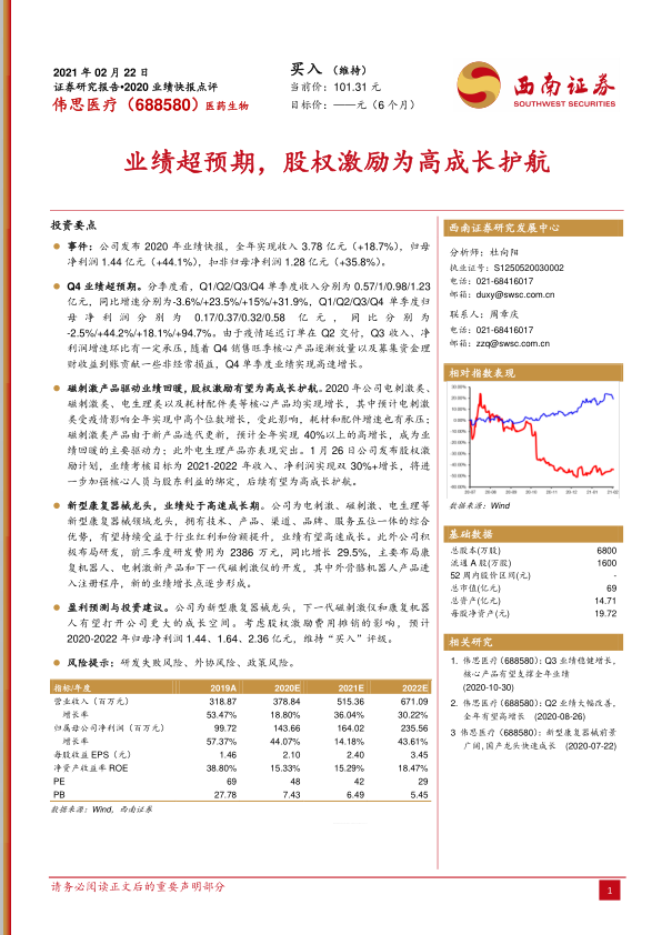 伟思医疗2020年业绩快报显示,公司全年收入和归母净利润分别实现18.7%和44.1%的显著增长,其中第四季度表现尤为突出,净利润同比增速高达94.7%。磁刺激产品线的强劲增长是业绩回暖的关键驱动力。公司通过股权激励计划绑定核心团队利益,并持续加大研发投入,积极布局康复机器人和下一代磁刺激仪等前沿领域,为未来的持续高增长奠定了坚实基础。作为新型康复器械领域的龙头企业,伟思医疗有望凭借其综合优势和战略布局,在行业红利中实现市场份额的进一步提升。报告维持“买入”评级,但同时提示了研发、外协和政策等潜在风险。