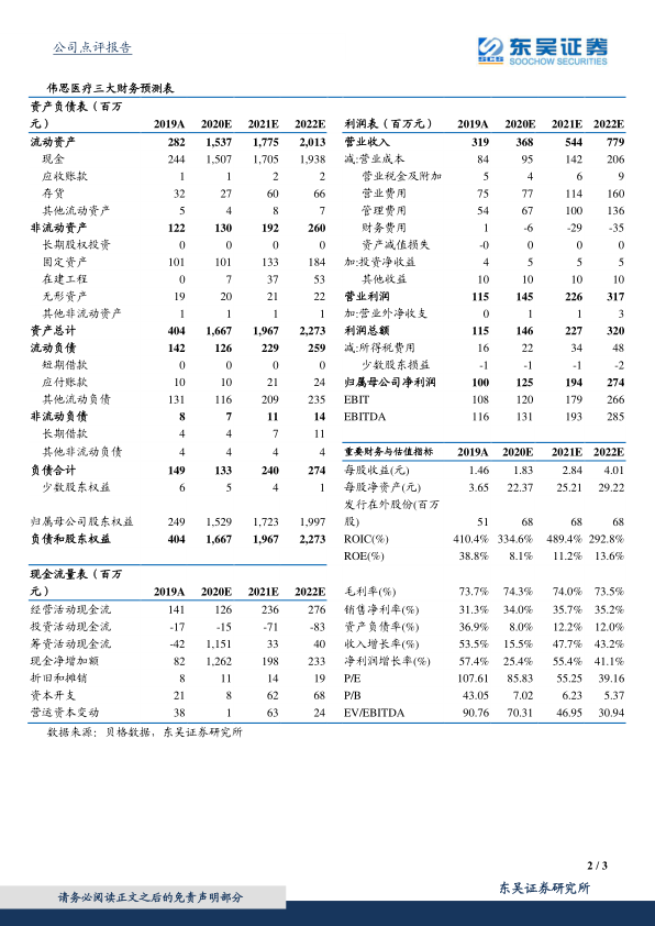 本报告分析了伟思医疗 2020 年前三季度的经营情况,并对公司所处的康复医疗器械行业和康复机器人市场进行了深入研究。报告认为,伟思医疗作为康复医疗行业的领先企业,将受益于行业的高速发展和康复机器人市场的巨大潜力。公司 Q3 业绩稳健增长,研发投入加大,康复机器人产品线逐步完善,未来成长空间广阔。维持“买入”评级。