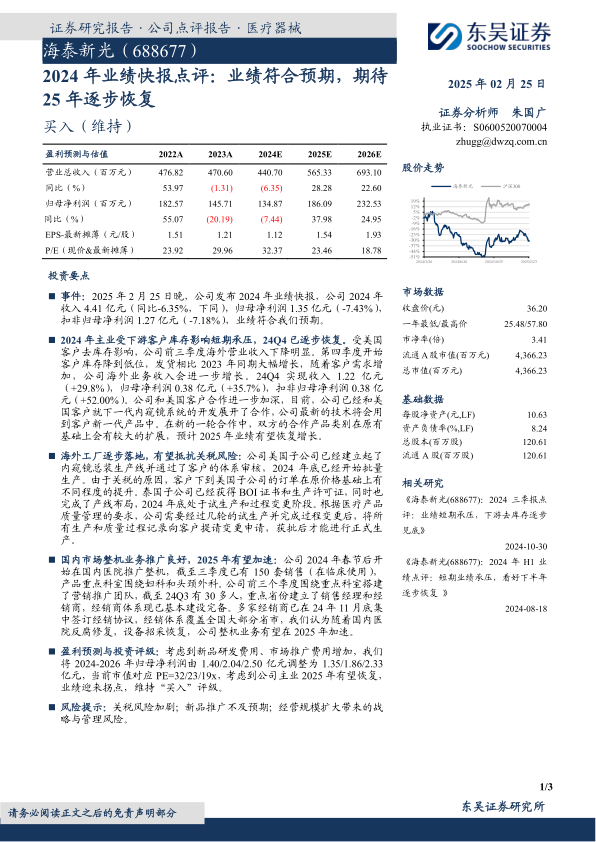事件:2025年2月25日晚,公司发布2024年业绩快报,公司2024年收入4.41亿元(同比-6.35%,下同),归母净利润1.35亿元(-7.43%),扣非归母净利润1.27亿元(-7.18%),业绩符合我们预期。