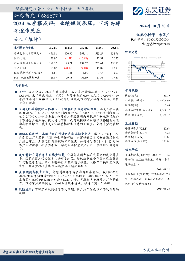 本报告分析了海泰新光2024年三季报,指出公司业绩受到下游去库存的影响,短期内有所承压。但公司积极布局海外,整机设备销量保持增长,且与大客户史赛克保持稳定合作。考虑到下游客户采购恢复和海外工厂投产等因素,公司业绩有望迎来拐点。因此,维持对海泰新光的“买入”评级。