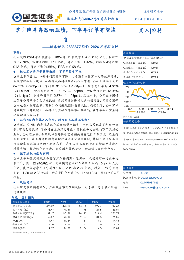 海泰新光2024年上半年业绩受核心客户库存调整影响而承压,营业收入和归母净利润均出现下滑。然而,公司毛利率和净利率保持稳定,并通过设立海外子公司和推出第二代4K内窥镜系统等战略举措,积极应对市场挑战并布局未来增长。随着核心客户库存的逐步出清和新产品的市场推广,公司下半年业绩有望恢复增长。分析师维持“买入”评级,并预计未来几年公司营收和净利润将持续增长,但同时提示了研发、产品放量及客户依赖等潜在风险。