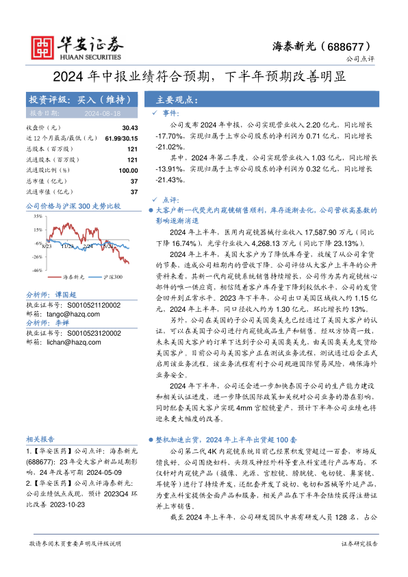 海泰新光2024年中报业绩符合预期,短期受大客户库存调整影响,但长期来看,受益于国产替代趋势和自身技术积累,公司下半年业绩有望改善,整机放量增长将贡献新的增长点。维持“买入”评级,但需关注国内市场拓展、海外订单波动以及国际贸易环境等风险。