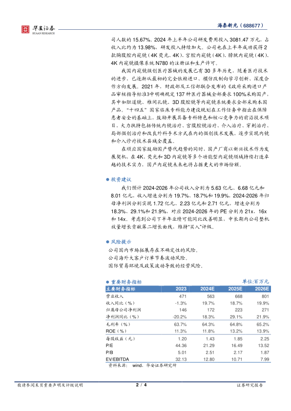 我们预计2024-2026年公司收入分别为5.63亿元、6.68亿元和8.01亿元,收入增速分别为19.7%、18.7%和19.9%,2024-2026年归母净利润分别实现1.72亿元、2.23亿元和2.71亿元,增速分别为18.3%、29.1%和21.9%,对应2024-2026年的PE分别为21x、16x和14x。考虑到公司下半年业绩可能同比改善明显,中长期内公司整机放量增长贡献第二增长曲线,维持“买入”评级。