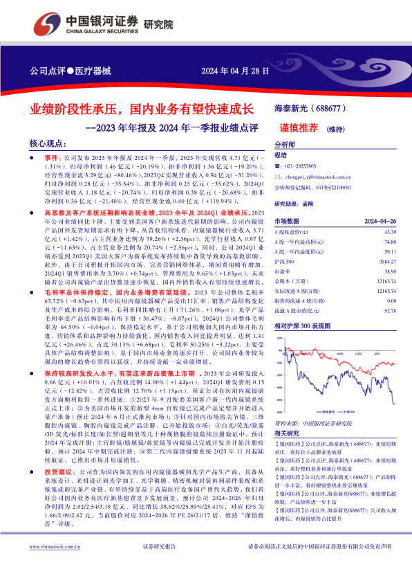 海泰新光在2023年及2024年一季度面临业绩短期承压,主要系海外大客户系统迭代延期及高基数效应所致。然而,公司展现出强大的内生增长动力,尤其是在国内市场,通过积极的市场开拓策略,国内销售收入实现显著增长,并有望延续强劲的增长趋势。公司持续高强度的研发投入,确保了多款创新产品的顺利开发和上市,进一步巩固了其在医用内窥镜领域的竞争优势。展望未来,凭借其完备的产业链和在国产替代浪潮中的战略定位,海泰新光有望在国内外市场实现快速发展。尽管存在海外业务进展、国内产品放量及研发进展不及预期的风险,但公司在国内市场的增长潜力和新品上市预期,为其长期发展提供了坚实支撑,因此维持“谨慎推荐”评级。