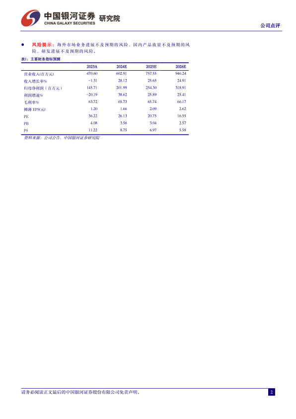 同时,报告提示以下风险:海外市场业务进展不及预期的风险、国内产品放量不及预期的风险、以及研发进展不及预期的风险。