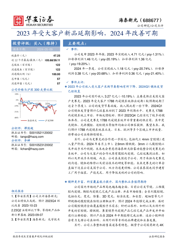 海泰新光2023年业绩受到大客户新品延期的不利影响,但预计2024年将迎来改善。公司与大客户史赛克的合作深化,以及国内整机业务的拓展,为未来增长奠定基础。