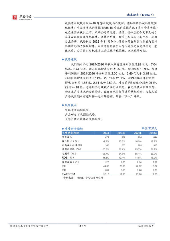 我们预计公司2024-2026年收入端有望分别实现5.92亿元、7.04亿元、8.44亿元,收入同比增速分别为25.8%、18.9%和19.9%,归母净利润预计2024-2026年分别实现2.00亿元、2.60亿元和3.15亿元,利润同比增速分别为37.4%、29.7%和21.1%。2024-2026年对应的EPS分别约1.65元、2.14元和2.59元,对应的PE估值分别为29倍、22倍和18倍,考虑到公司硬镜产品行业领先,在光学技术积累深厚,和大客户史赛克的合作紧密,且自身从零部件进军整机系统,未来在国产替代浪潮中有望取得一定市场份额,维持“买入”评级。
