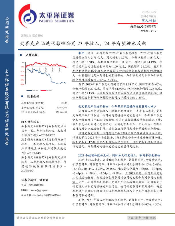 2023年前三季度,公司的综合毛利率、销售费用率、研发费用率、管理费用率、财务费用率、净利率(扣非归母)分别为64.10%、3.48%、14.41%、10.11%、-1.22%、29.48%,同比变化分别为-1.56pct、+0.36pct、+2.43pct、+1.79pct、+2.64pct、-8.58pct。自2023年起,公司开始向员工兑现股权激励,相关股份支付费用对公司的毛利和期间费用均有影响。此外,公司综合毛利率还受到生产设备折旧的影响;公司加大了研发投入以丰富内窥镜的产品门类,使得研发费用率有所提升;而汇率波动产生的汇兑收益以及活期存款利息收入少于去年同期造成了财务费用率的提升。