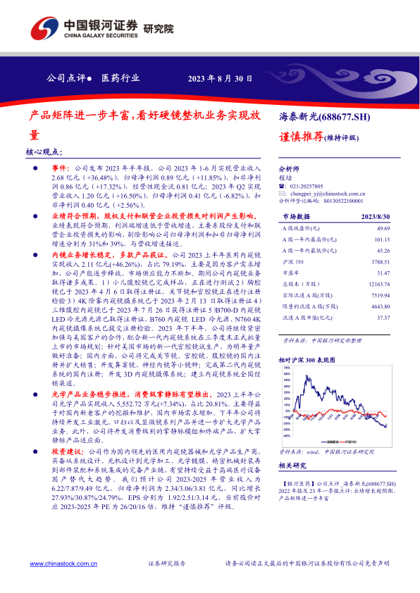 作为国内领先的医用内窥镜器械和光学产品生产商,海泰新光具备完整的产业链优势,有望持续受益于高端医疗设备国产替代趋势。分析师预计公司2023-2025年营业收入分别为6.22亿元、7.87亿元和9.49亿元,归母净利润分别为2.34亿元、3.06亿元和3.81亿元,同比增长27.93%、30.87%和24.79%。对应的EPS分别为1.92元、2.51元和3.14元。当前股价对应2023-2025年PE分别为26倍、20倍和16倍。分析师维持“谨慎推荐”评级。