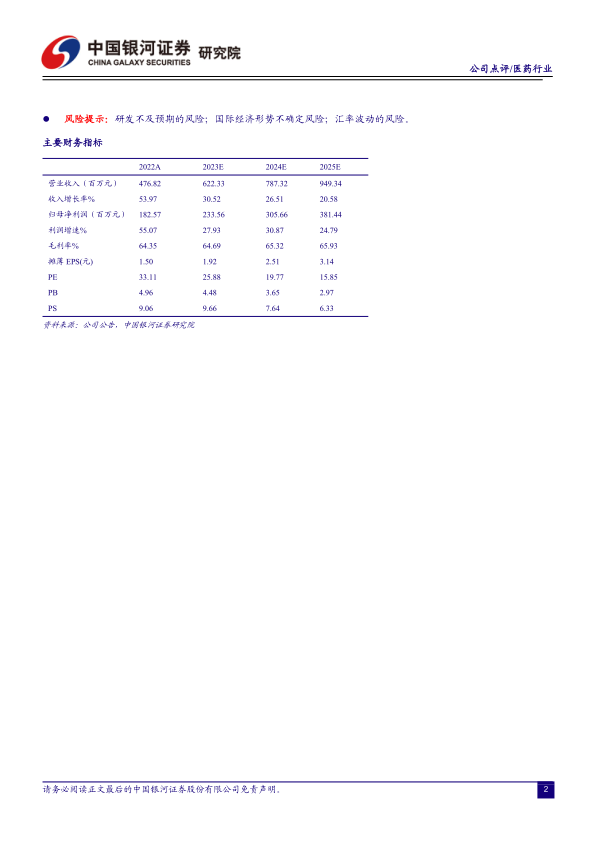 投资建议:公司作为国内领先的医用内窥镜器械和光学产品生产商,具备从系统设计、光机设计到光学加工、光学镀膜、精密机械封装再到部件装配和系统集成的完备产业链,有望持续受益于高端医疗设备国产替代大趋势。我们预计公司2023-2025年营业收入为6.22/7.87/9.49亿元,归母净利润为2.34/3.06/3.81亿元,同比增长27.93%/30.87%/24.79%,EPS分别为1.92/2.51/3.14元,当前股价对应2023-2025年PE为26/20/16倍,维持“谨慎推荐”评级。