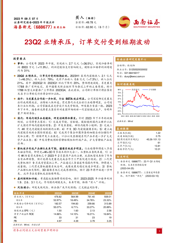海泰新光2023年中报显示,公司业绩短期受到疫情影响,但长期向好趋势不变。公司与史塞克合作持续深化,海外市场增长稳健;国内市场加大研发投入,多品类产品有序推进。盈利能力维持高水平,未来发展可期。维持“买入”评级。