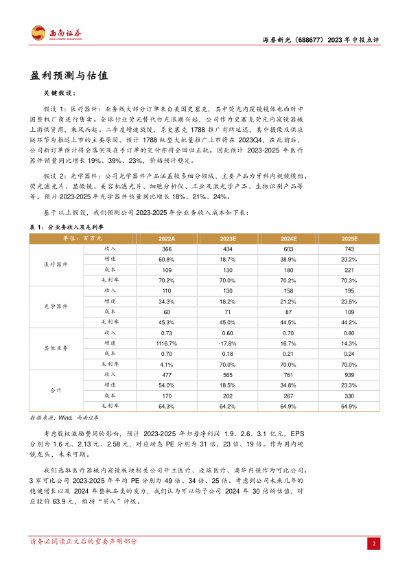 盈利预测和评级:考虑股权激励费用的影响,预计2023-2025年归母净利润1.9、2.6、3.1亿元。作为国内硬镜龙头,未来可期,维持“买入”评级。