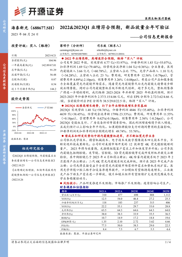 海泰新光在2022年及2023年第一季度均实现了营收和净利润的强劲增长,业绩表现超出市场预期。公司受益于医用内窥镜市场中荧光内窥镜替代白光内窥镜的行业大趋势,以及其在内窥镜整机系统和光学产品领域的持续创新和市场拓展,展现出广阔的市场发展前景。