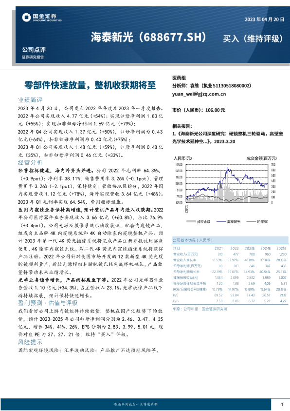 海泰新光在2022年及2023年第一季度表现出强劲的业绩增长,得益于医用内窥镜核心业务的高速发展和海内外市场的均衡拓展。公司经营指标健康,毛利率和净利率表现优异。特别是在医用内窥镜整机产品方面,4K系统及相关配套产品预计将在年内陆续完成注册并进入临床和量产阶段,有望成为未来业绩增长的重要驱动力。光学器件业务也保持稳健增长。基于对公司上游组件放量和整机国产化趋势的看好,国金证券维持“买入”评级,并预测未来三年归母净利润将持续增长。投资者需关注国际宏观环境、汇率波动及产品推广等潜在风险。