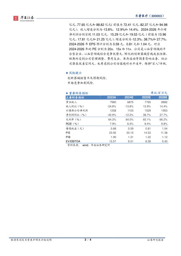 我们调整了盈利预测,预计2024-2026年公司收入分别为68.75亿元、77.65亿元和88.82亿元(前值为72.41亿元、82.37亿元和94.98亿元),收入增速分别为-13.8%、12.9%和14.4%,2024-2026年归母净利润分别实现11.03亿元、15.29亿元和19.53亿元(前值为13.96亿元、17.81亿元和21.25亿元),增速分别为-12.3%、38.7%和27.7%,2024-2026年EPS预计分别为0.59元、0.81元和1.04元,对应2024-2026年的PE分别为20x、15x和11x,公司是心血管领域的平台型企业,心血管领域综合竞争优势大,孵化的创新器械管线成长性强,短期内受到公司管理调整、费用支出、库存波动等因素影响业务,但公司潜在改善空间大,也考虑到公司估值绝对水平适中,维持“买入”评级。