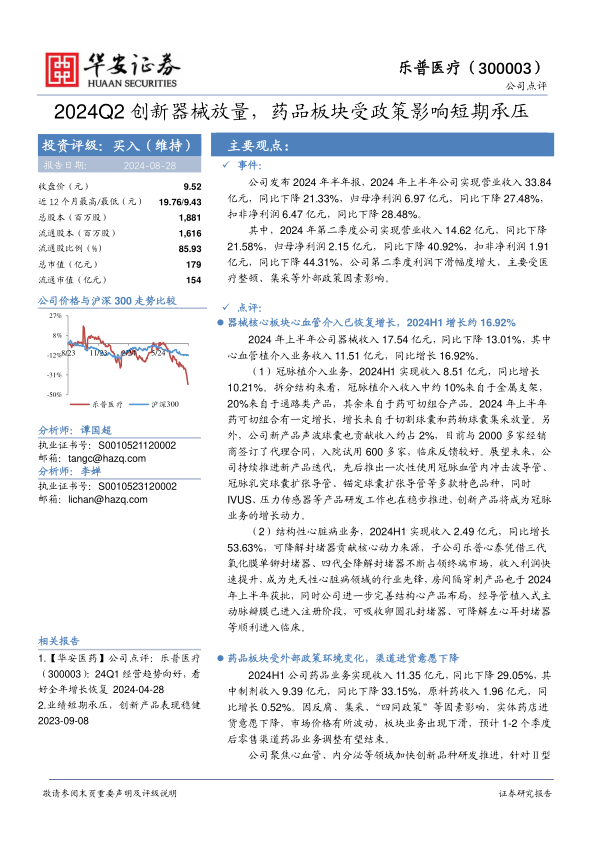 乐普医疗2024年上半年业绩受到外部政策环境的影响,药品业务承压,但器械板块表现亮眼,尤其是心血管介入和结构性心脏病业务增长迅速。公司持续投入创新研发,未来有望通过创新产品驱动业绩增长。维持对乐普医疗的“买入”评级,但需关注创新器械销售和市场竞争风险。