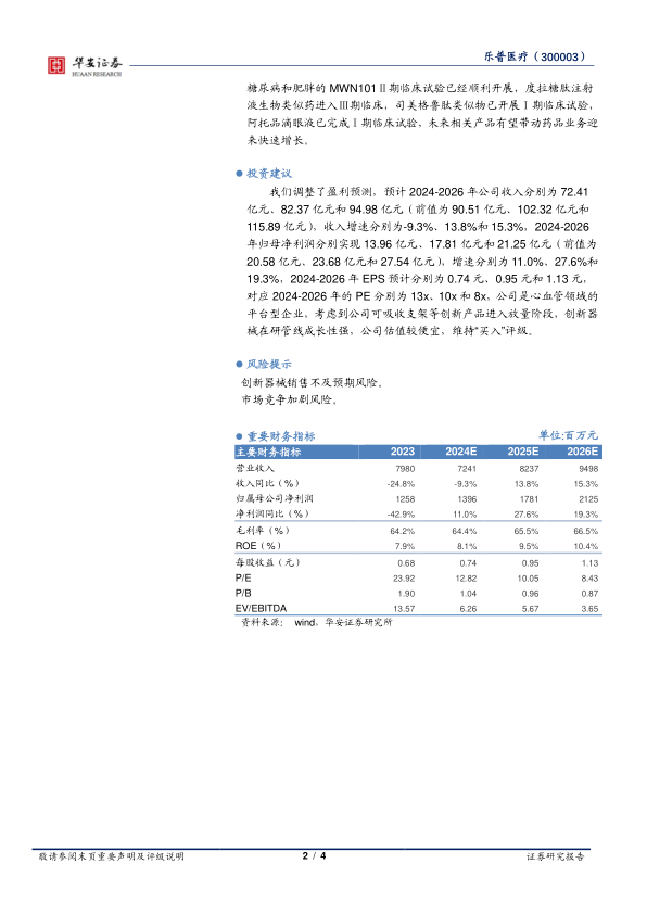 我们调整了盈利预测,预计2024-2026年公司收入分别为72.41亿元、82.37亿元和94.98亿元(前值为90.51亿元、102.32亿元和115.89亿元),收入增速分别为-9.3%、13.8%和15.3%,2024-2026年归母净利润分别实现13.96亿元、17.81亿元和21.25亿元(前值为20.58亿元、23.68亿元和27.54亿元),增速分别为11.0%、27.6%和19.3%,2024-2026年EPS预计分别为0.74元、0.95元和1.13元,对应2024-2026年的PE分别为13x、10x和8x,公司是心血管领域的平台型企业,考虑到公司可吸收支架等创新产品进入放量阶段,创新器械在研管线成长性强,公司估值较便宜,维持“买入”评级。